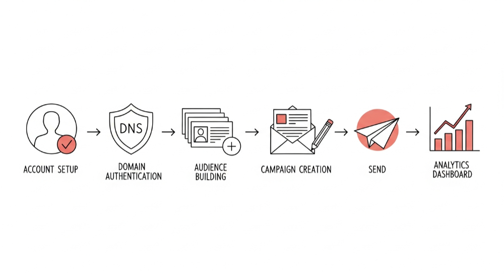 Beginners should avoid skipping domain authentication, importing contacts without proper consent, neglecting mobile optimization, and ignoring list hygiene practices.