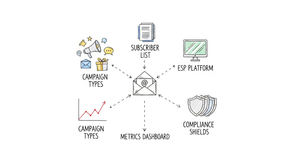 Email marketing requires several essential components working together to deliver targeted messages to opted-in subscribers.